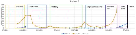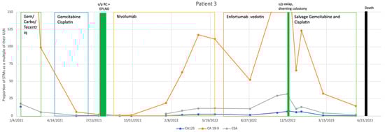 Our second patient was a 65-year-old man with high-grade papillary MIBC diagnosed in early 2020. He could not tolerate neoadjuvant Gemcitabine and Cisplatin and subsequently developed severe bilateral hydronephrosis. Consequently, he was referred to our urology clinic for upfront RC in mid-2020. Preoperative staging imaging was negative for metastasis but he had high CA 19-9 levels. However, surgery was aborted upon direct inspection of extensive peritoneal seeding of the tumor. His treatment plan was changed to dose-dense Methotrexate, Vinblastine, Doxorubicin, and Cisplatin (ddMVAC). Despite this treatment, CA 19-9 remained elevated, and CA-125 also showed a small increase. Upon completion of ddMVAC therapy, maintenance Avelumab was started for him. His STMs started rising in late 2020 and all three reached abnormally high levels despite receiving Avelumab. This increase prompted expedited imaging with PET/CT scan which suggested disease progression. Hence, his treatment regimen was changed to Enfortumab Vedotin, which managed to control and reduce CA 19-9 dramatically through the next 4–5 months. Unfortunately, CA 19-9 level rose significantly again after this and repeat imaging revealed progression of disease, leading to a switch to Sacituzumab Govitecan. Later, his STMs levels continued to fluctuate, forcing change in treatment plan from Sacituzumab Govetican to palliative RC in mid-2021 and later to salvage Gemcitabine in late 2021, Paclitaxel in early 2022, and eventually Carboplatin as the last resort. Unfortunately, he succumbed to cancer in mid-2022 (see Figure 2).