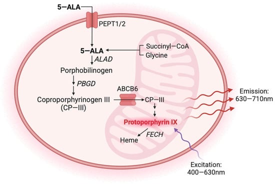Simplified 5-ALA metabolic pathway. Exogenous 5-ALA enters cells via the transporters peptide transporter 1 (PEPT1) and peptide transporter 2 (PEPT2). Endogenous 5-ALA is synthesized from succinyl-CoA and glycine in the mitochondria. Once inside the cell, 5-ALA is converted into porphobilinogen by ALA dehydratase (ALAD). Porphobilinogen is converted into coproporphyrinogen III through a series of enzymatic reactions beginning with porphobilinogen deaminase (PBGD). Coproporphyrinogen III is translocated from the cytoplasm into the mitochondria by the transporter ABCB6. Protoporphyrin IX (PPIX) is produced following a series of enzymatic reactions and converted into heme by ferrochelatase (FECH). The excitation and emission wavelengths of PPIX, approximately 400–630 nm and 630–710 nm, respectively, contribute to its utility as an optical imaging agent. Figure created with BioRender.com; accessed on 19 February 2025).