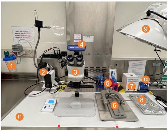 Surgical field setup with (1) vacuum trap; (2) CoolLED pE300 multiband LED light source; (3) ZEISS Stemi 508 stereo microscope with chroma filter set AT425/50x, AT485DC, AT655/30m; (4) ZEISS Axiocam 202 mono microscope camera; (5) sterile Pasteur pipettes, cotton-tipped applicators, and tubes of 2% chlorhexidine, saline, 70% ethanol, and 3% hydrogen peroxide; (6) small animal stereotaxic frame with ear bars and adjustable platform; (7) bead sterilizer; (8) sterile surgical equipment (scalpel, forceps, drill bit, staples, staple applicator) (9) light source; and (10) micromotor kit with rotary handpiece, control box, and foot pedal (pedal under table; not shown in picture).
