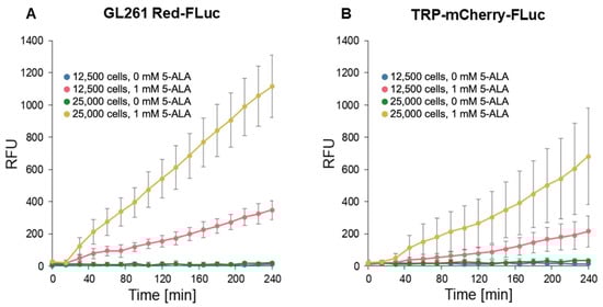 In vitro fluorescence of GL261 Red-FLuc and TRP-FLuc following incubation with 5-ALA. (A) Quantified in vitro fluorescence of 12,500 and 25,000 GL261 Red-FLuc cells over four hours after adding either 0 mM or 1 mM 5-ALA (n = 6, 3 technical replicates; data points represent mean ± SEM). (B) Quantified in vitro fluorescence of 12,500 and 25,000 TRP-mCF cells over four hours after adding either 0 mM or 1 mM 5-ALA (n = 6, 3 technical replicates; data points represent mean ± SEM). As described in the text, 5-ALA treatment significantly increased the rate of RFU increase over time, as did higher seeding count. Errors are SEM calculated by pooled variances.