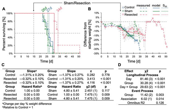 Data were analyzed by generalized mixed-level linear models for all data, except that Cox survival models were applied to survival times, and joint models for combined longitudinal and time-to-event data [] were applied to mean change in body weight and mean post-resection luminescence vs. time. Joint modeling was conducted for time points beginning on the day of resection and ending on the last day when more than one animal was alive in a group. Nakagawa’s coefficient of determination (R2) was used [] for all models except for Cox models, where Nagelkerke’s R2 [] was used. Comparing more than two pairwise differences was challenging since no formal method is known for such comparisons in joint models. Therefore, pairwise models were also constructed, and p values for hazard ratios and longitudinal trends were adjusted by the Benjamini–Hochberg false discovery rate []. Analysis was performed with the R statistical environment (4.2.2) [] and the JM (1.5-2) [], lme4 (1.1-35.5) [], performance (0.12.4) [], and survival (3.7-0) [] packages.