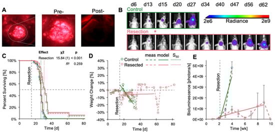 Effects of GL261 Red-FLuc tumor resection on survival, body weight change, and tumor growth. Animals were implanted with 5000 GL261 Red-FLuc cells on day 0, and tumors were resected on day 14 (n = 32: control, 21: resection). (A) Representative image of fluorescent tumor tissue pre- and post-resection. (B) Representative in vivo bioluminescence images in J:NU mice intracranially injected with 5000 GL261 Red-FLuc cells. Resections were conducted 14 days post-implantation, while control mice received no intervention. Total emission range: 2 × 106 to 2 × 109 photons/s. (C) Survival curve of control and resection GL261 Red-FLuc mice with median survivals of 27 and 32d, respectively. Survival analysis using the Cox model demonstrated that resection enhanced median survival. The dotted line corresponds to the day of sham or resection procedures (d14). One resection animal was euthanized after 12 weeks due to the absence of recurrent tumor evidence on bioluminescence imaging. (D) Normalized (% of day 0) weight of control and resection mice. The horizontal dotted line corresponds to the day of resection (d14). Analysis of % weight change from day 0 by joint longitudinal and time-to-event model showed that resection significantly reduced the rate of weight loss. (E) Average quantified tumor bioluminescence by week, demonstrating a significant difference in bioluminescence between control and resection mice beginning at week three post-implantation (one-week post-resection). (F) Quantified tumor bioluminescence on day 13 (one day pre-resection) and day 15 (one day post-resection) for resection mice, demonstrating an average resection extent of 91.6% (p < 0.001). Pink corresponds to average values. (G) An evaluation of the impact of extent of resection on survival outcomes.