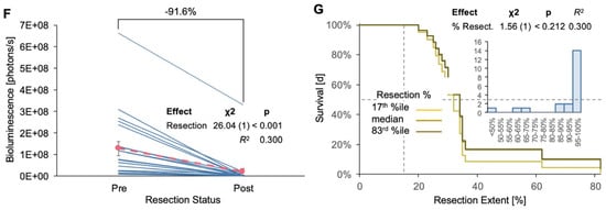 We also resected tumors in GL261 Red-FLuc mice and monitored their survival, body weight loss, and relative tumor growth (Figure 6). Sham-operated animals were omitted from this study as there was no difference in survival or rate of body weight loss compared to controls (Figure 5). Representative images depicting 5-ALA-induced fluorescence of tumor pre- and post-resection, along with the temporal progression of tumor bioluminescence, are illustrated in Figure 6A,B, respectively. Resection resulted in a significant increase in survival compared to unresected controls (27 vs. 32d; p < 0.001) (Figure 6C). Additionally, weight loss in resected animals was significantly slower than in unresected animals (Figure 6D, Table 3). Similar to observations in TRP-mCF mice, the abrupt increases in weight towards the end of the study were attributed to the loss of mice with 25% weight loss nearing the experimental endpoint, with the remaining animals’ weights contributing to sharp rises in the group average. Therefore, we caution against overinterpreting the predicted trend for weight change in resected animals, as median survival for resected animals was at 32 days. As time progressed, fewer animals survived, enhancing any survivor effect on the overall trend. While tumor (re)growth was slower in resected animals (Figure 6E, Table 4), the association coefficient was not significant, indicating that the event process (death) did not significantly influence the trajectory of the longitudinal process (luminescence) in this context. Regarding the extent of resection, bioluminescence levels on the day following resection exhibited a significant decrease compared to corresponding pre-resection values, with an average reduction in tumor bioluminescence of 91.6% (Figure 6F). Finally, we explored whether the extent of resection impacted survival (Figure 6G), a factor demonstrated in clinical studies [,,]. However, we observed no significant effect, which was anticipated given that 86% of mice underwent resection of at least 85% of the tumor, and 67% had tumor resection exceeding 95% (Figure 6G inset). Overall, these findings emphasize the survival advantage conferred by tumor resection and reinforce the importance of surgical intervention in preclinical GBM models.