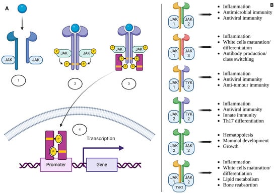 JAK-signal transduction pathway and its role in cellular signalling and immune regulation. (A) The schematic representation shows the JAK–STAT signalling cascade: (1) Cytokine binding induces receptor dimerisation, activating JAKs. (2) JAKs phosphorylate the receptor and recruit STAT proteins. (3) Phosphorylated STATs dimerise and translocate to the nucleus. (4) STATs bind DNA promoters, initiating gene transcription. (B) Different JAK pairings and their downstream effects, highlighting specific immune and inflammatory processes such as antiviral immunity, antibody production, Th17 differentiation, hematopoiesis, and bone metabolism. This pathway is a key target for therapies addressing inflammatory and autoimmune diseases.