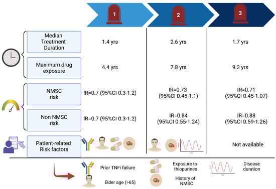 Long-term tofacitinib safety. The results from three integrated analyses, based on data from three phase 2 and phase 3 induction studies, a phase 3 maintenance study, a long-term extension study, an open-label, and a phase 3b/4 study. NMSC: non-melanoma skin cancer; IR: incidence rate; CI: confidence interval; TNFi: tumour necrosis factor inhibitors. REFERENCES: milestone 1: [38]; milestone 2: [39]; milestone 3: [40].