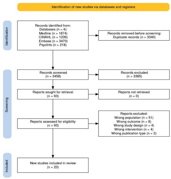 In total, 6798 studies were identified; after removing duplicates, 3458 studies were screened. Twenty-three studies containing 21 interventions and 581 patient participants met the eligibility criteria for inclusion in the review (Figure 1).