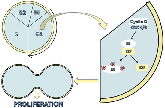 These drugs are administered orally, and their function is to inhibit cyclin-dependent kinases 4 and 6 (CDK4 and CDK6, respectively). These kinases promote the transition from the G1 phase of the cell cycle to the S phase by causing the release of the E2F transcription factor. The transcriptional function of E2F is inhibited by the retinoblastoma suppressor protein (RB), as it directly binds to the activation domain of E2F when it is not phosphorylated, thereby blocking it. At the beginning of the G1 phase, RB is dephosphorylated and thus blocks the activation of E2F. At this point in the cell cycle, the presence of growth factors increases the levels of cyclin D, which bind to CDK4 and 6, forming a complex which combines with a third protein (p21 or p27) and resulting in an enzyme that phosphorylates the RB protein. This phosphorylation releases the E2F transcription factor, allowing it to function (Figure 1) [8].