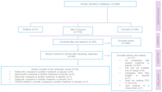 During this process, a total of 2029 articles were screened, of which 1806 were excluded at the initial stage after evaluating the titles and abstracts because they did not address advanced or metastatic breast cancer with positive hormone receptors and HER-2 negative.