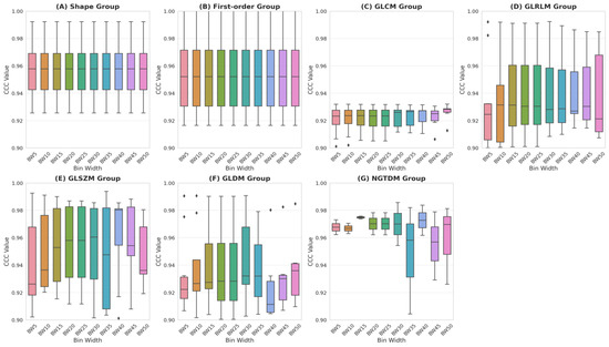 First-order features showed consistent stability, with seven features achieving CCC ≥ 0.9 (Figure 2B). Shape features had the highest repeatability (85%), with 12 features remaining consistent across all BWs (Figure 2A). It is important to note that shape features remained unaffected by gray-level binning; thus, any observed differences solely reflected variations in lesion shape between test and retest scans. In contrast, texture features exhibited greater sensitivity to BW variations. The GLCM repeatability differed above and below a BW of 25 (Figure 2C). The GLRLM and GLSZM were more repeatable at finer BWs (Figure 2D,E), whereas the GLDM and NGTDM achieved better repeatability at larger BWs, particularly those of 30 and 35 (Figure 2F,G).