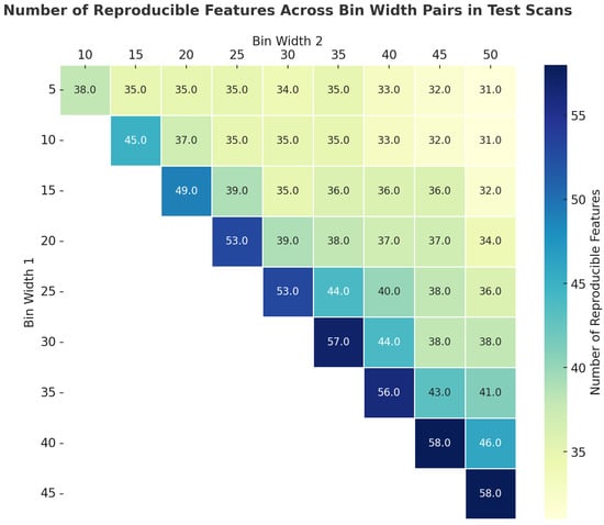 Reproducibility assessed how many features remained consistent when the BW changed for the same scan. The highest reproducibility was observed between larger BWs, with 58 features reproducible between BWs of 30 and 40. In contrast, the smallest BWs (5 and 10) had the lowest reproducibility, with only 38 features. Intermediate BWs, such as those of 20 and 25, showed a moderate reproducibility of 53 features (Figure 3).
