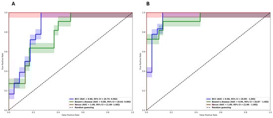 In comparison, the RFE-based classifier demonstrated a lower performance on the test set, with an accuracy of 76%. The per-class AUCs for the RFE model were 0.86 (95% CI: 0.75–0.96) for BCC, 0.80 (95% CI: 0.62–0.89) for Bowen’s disease, and 1.00 (95% CI: 1.00–1.00) for nevi (Figure 4A, Appendix B—Table A2)