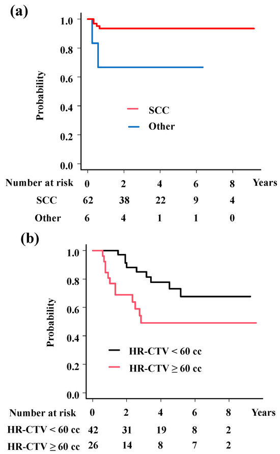 StatView 5.0 and the EZR stat package version 1.65 was used for statistical analysis [16]. Percentages were analyzed using Fisher’s exact test, and Student’s t-tests were performed for normally distributed data. The Mann–Whitney U-test for skewed data was performed for comparison. The Kaplan–Meier method was used to analyze the OS, PFS, and LC, all of which were calculated beginning from the first day of PBT. Multivariate Cox regression models were applied for OS, PFS, and LC. The candidate covariates in these models were age (continuous), overall treatment time (OTT) (<50 days vs. ≥50 days), EQD2 (<90 Gy vs. ≥90 Gy), HR-CTV (<60 cc vs. ≥60 cc), histology (squamous cell carcinoma C vs. others), T (2 vs. 3 vs. 4), lymph node (pelvic LN (+) vs. (−), M (para-aortic LN (+) vs. (−)), and concurrent chemotherapy (yes vs. no). Variable selection for multivariate models was conducted using the stepwise method with the AIC, and p < 0.05 was considered statistically significant. Cut-off values for HR-CTV, OTT, and EQD2 were calculated using receiver operating characteristic analysis or set at the median or mean value when not specified.