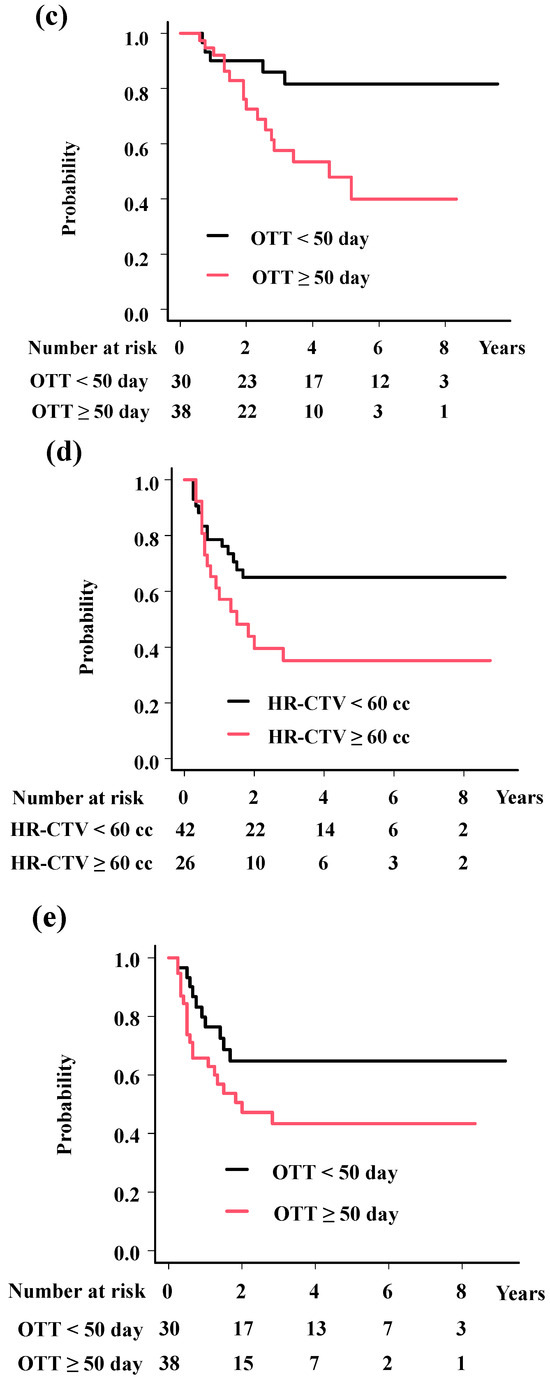 The analyses showed significant associations of histology (HR = 0.16; 95%CI = 0.03–0.9, p = 0.037, Figure 3a) with LC; HR-CTV volume (HR = 5.76; 95%CI = 2.17–15.27, p = 0.00044, Figure 3b) and OTT (HR = 6.69; 95%CI = 2.21–20.26, p = 0.00078, Figure 3c) with OS; and HR-CTV volume (HR = 2.19; 95%CI = 1.05–4.57, p = 0.036, Figure 3d), OTT (HR = 2.21; 95%CI = 1.02–4.77, p = 0.045, Figure 3e), and M category (HR = 2.47; 95%CI = 1.04–5.85, p = 0.04, Figure 3f) with PFS.