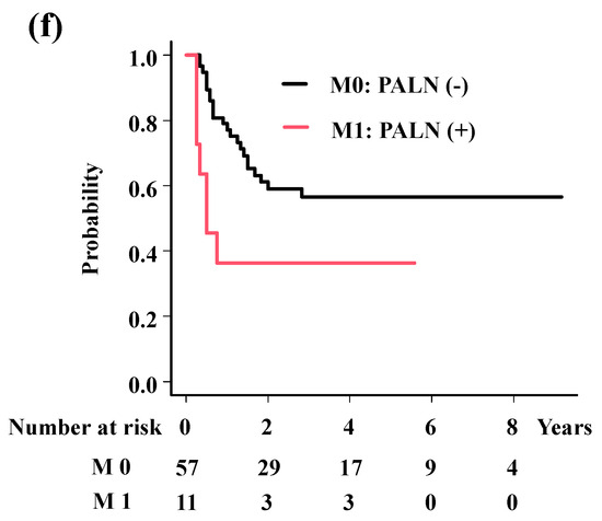 Survival analysis according to predisposing factors. (a) Local control rates according to histology. The 3-year local control rates were 93.5% and 66.7% for squamous cell carcinoma and others (p = 0.0173). (b) Overall survival rates according to volume of HR-CTV. The 3-year overall survival rates were 85.0% and 49.2% for patients with HR-CTV < 60 cc and HR-CTV ≥ 60 cc (p = 0.017). (c) Overall survival rates according to overall treatment time. The 3-year overall survival rates were 85.9% and 57.5% for patients with OTT < 50 days and OTT ≥ 50 days (p = 0.0123). (d) Progression-free survival time according to volume of HR-CTV. The 3-year progression-free survival rates were 64.9% and 35.1%, for patients with HR-CTV < 60 cc and HR-CTV ≥ 60 cc (p = 0.0386). (e) Progression-free survival time according to overall treatment time. The 3-year progression-free survival rates were 64.8% and 43.3% for patients with OTT < 50 days and OTT ≥ 50 days (p = 0.0875). (f) Progression-free survival time according to M category. The 3-year progression-free survival rates were 56.6% and 36.4% for patients with para-aortic lymph node (−) and (+) (p = 0.0171). p values were calculated with log-rank test.