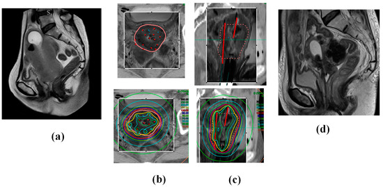 A 68-year-old woman presented with cervical cancer with uterine corpus invasion cT3bN1M0 (Stage 3B). The tumor exhibited significant extension into the lateral pelvic wall and corpus, with an initial gross tumor volume of 190.7 cc. The patient underwent whole-pelvic external beam radiotherapy (WP EBRT; 30 Gy in 15 fractions) with concurrent chemotherapy (40 mg/m2, q1 week CDDP × 5 times). The tumor volume reduced to 133.3 cc, and the patient underwent ISBT (30 Gy/5 fractions in 3 days administered twice daily). She continued to receive CS EBRT (10 Gy/10 fractions) and a lymph node boost EBRT (6 Gy/3 fractions). The patient remains in complete remission and alive 38 months post-treatment, with no evidence of recurrence. (a) Initial MRI image (Sagittal image). (b) Axial images and (c) Sagittal images of CT (outside of the rectangle) and MRI (inside of the rectangle) fusion images used in ISBT planning taken after the ISBT procedure. The pink line in the upper panel indicates the HR-CTV, and the red points and lines indicate the applicators. Note 100% isodose line (red line) fit to the HR-CTV in the bottom panel. (d) MRI image 4 months later (complete remission status).