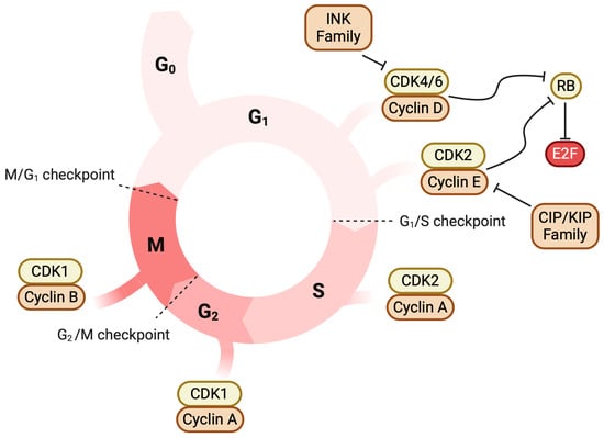 The cell cycle is highly regulated through a host of factors including cyclins, cyclin-dependent kinases, cyclin-dependent kinase inhibitors, and other regulatory elements [7]. A series of checkpoints exists between the major phases of the cell cycle that prevents the cell from dividing inappropriately. Cyclin levels rise and fall during different parts of the cell cycle and influence the activity of CDKs, which are present at stable levels throughout the cell cycle. Cyclin D and E rise during the G1 phase, while cyclin A rises during the S phase and G2 phase, and cyclin B rises during the M phase. Cyclin D production is regulated by the mitogen-activated protein kinase (MAPK) and phosphoinositide 3-kinase (PI3K) pathways. Various mechanisms that survey the integrity of DNA interface with this system and allow for further regulation of the cell cycle. For example, DNA damage can lead to the activation of the ataxia-telangiectasia mutated (ATM) and ataxia-telangiectasia and rad-3 related (ATR) kinases, which in turn activates checkpoint kinase 1 (CHK1) and checkpoint kinase 2 (CHK2), which can inhibit the cell cycle through multiple mechanisms. One particularly important mechanism is the phosphorylation of p53, which prevents p53 degradation and allows p53 to function as a transcription factor to hundreds of genes, resulting in the production of several cell-cycle inhibitors such as p21, which inhibits the cyclin D–CDK4/6 complex, which is critical to the G1/S checkpoint [8,9]. During the G1/S checkpoint, rising levels of cyclin D activate CDK4/6, while rising levels of cyclin E activate CDK2, forming active kinase complexes that phosphorylate the retinoblastoma protein (Rb), releasing Rb’s inhibition of the transcription factor E2F. In addition to the factors described above, this process is regulated by cell cycle division protein 25a (CDC25A), INK4 family proteins, and CIP/KIP family proteins. Once disinhibited, E2F can activate the transcription of genes needed to begin the S phase [6,8,10,11]. The cyclin A–CDK2 complex is needed to progress through the S phase, while the cyclin B–CDK1 complex is required to progress through mitosis [8,12,13]. A variety of other regulatory elements are involved in either inhibiting or promoting these processes and are critical to normal cell division; they have been thoroughly summarized elsewhere [6,8,14]. The major cell cycle checkpoints are summarized in Figure 1.