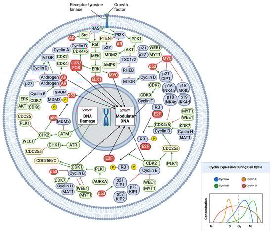 In response to growth signaling from androgen receptor pathways as well as other growth factor pathways such as the MAPK and PI3K pathways, cyclin D levels rise at the beginning of the cell cycle and form a complex with CDK4 and CDK6. This complex is activated by the CDK-activating kinase (CAK), which is composed of CDK7, Cyclin H, and MAT1. PLK1 activates CDC25a, which is another activator of this complex, while the INK family proteins and WEE1/MYT1 inhibit cyclin D–CDK4/6 activity. Cyclin D–CDK4/6 phosphorylates Rb, leading to reduced affinity for E2F. The cyclin E–CDK2 complex further phosphorylates Rb, disinhibiting E2F, which subsequently travels to the nucleus to modulate transcription. The cyclin E–CDK2 complex is activated by CDC25a and inhibited by WEE1/MYT1 as well as the KIP/CIP family proteins. Later in the cell cycle, rising levels of cyclin B leads to complex formation with CDK1. This complex is activated by CAK, PLK1, and CDC25B/C, while it is inhibited by WEE1/MYT1. AURKA modulates the activity of PLK1. CDK1–cyclin B then travels to the nucleus, activating multiple components required for mitosis. DNA damage can lead to cell cycle arrest via activation of ATM/ATR and CHK1/2, which modulate multiple components of the cell cycle. The MAPK, PI3K, and AR pathways all intersect with these cell cycle components at multiple points. MAPK pathway activation ultimately leads to activation of cyclin D–CDK4/6 as well as inhibition of cell cycle inhibitors including p53, CIP/KIP, and INK family proteins. The PI3K pathway similarly modulates cyclin D levels as well as CIP/KIP family proteins, p53, and WEE1/MYT1 activity. AR activity is capable of directly modulating cell cycle activity while also increasing activity in both the MAPK and PI3K pathways [8,9,30,35,38,39,40,41,42,43,44,45,46,52,53,54,55,56,57,62,63,64,65,66]. Created in BioRender. Siskin, M. (2025) https://BioRender.com/x07a420 accessed on 15 January 2025. Color Code: In the above figure components coded red have transcription factor activity, pale yellow components have phosphatase activity and green components have kinase activity. All other components are coded in blue.