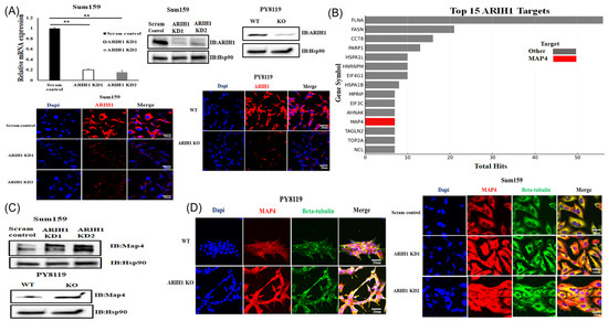 We utilized a BioID system that was previously established by our lab to identify ARIH1-interacting targets [20] and identified MAP4 as an ARIH1-interacting protein (Figure 2B). MAP4 is a microtubule-associated protein known to regulate microtubule stability [9,10,11]. Western blot analysis confirmed the differential expression of MAP4 in PY8119 and SUM159 cells under various conditions (Figure 2C). In SUM159 cells, MAP4 protein levels were markedly elevated in ARIH1 knockdown (KD1 and KD2) cells relative to scrambled controls (scram control) (Figure 2C, upper panel). In PY8119, MAP4 expression was similarly increased (Figure 2C, lower panel) in ARIH1 knockout (KO) cells compared to wild-type (WT) cells. These results suggest that ARIH1 negatively regulates MAP4 protein levels, either directly or indirectly.