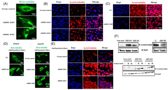 Additionally, we validated the impact of ARIH1 on microtubule dynamics by assessing beta-tubulin organization in cells upon treatment with a microtubule-stabilizing agent such as paclitaxel. Several studies have demonstrated that the pre-treatment state of microtubules is a critical factor influencing the extent of paclitaxel-induced microtubule stabilization [9,10,11,12,13,14,15,16,17]. Given that ARIH1 loss is associated with microtubule stabilization, we anticipated that ARIH1-deficient cells would exhibit heightened responsiveness to the microtubule-stabilizing effects of paclitaxel. PY8119 WT cells treated with 100 nM paclitaxel for 24 h showed moderately spindled microtubules, while ARIH1 KO cells displayed highly bundled, stabilized microtubules under the same conditions (Figure 3D, left panel). Similarly, SUM159 cells treated with 10 nM paclitaxel for 5 h demonstrated pronounced spindle formation in ARIH1 KD1 and KD2 cells compared to the scram control (Figure 3D, right panel). These findings suggest that ARIH1 loss amplifies the stabilizing effect of paclitaxel on microtubules.