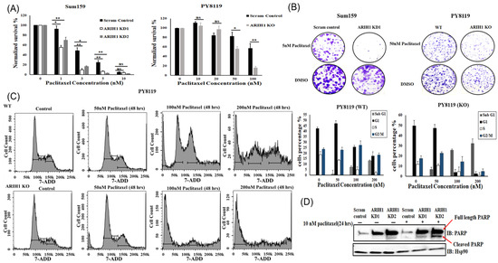 To investigate the mechanisms underlying the enhanced sensitivity of ARIH1-deficient cells to paclitaxel, we performed a flow cytometric analysis of the cell cycle (Figure 4C). In PY8119 WT cells treated with paclitaxel for 48 h, a dose-dependent increase in the sub-G1 population (indicative of apoptosis) was observed, along with G2/M arrest, which is consistent with paclitaxel’s mechanism of action. At 100 nM and 200 nM paclitaxel, sub-G1 populations reached 7.44% and 14.2%, respectively, in WT cells. In ARIH1 KO cells, the sub-G1 population increased significantly when compared to the WT cells at 100 nM (25.3%) and 200 nM (30.9%), indicating enhanced apoptosis upon ARIH1 loss.