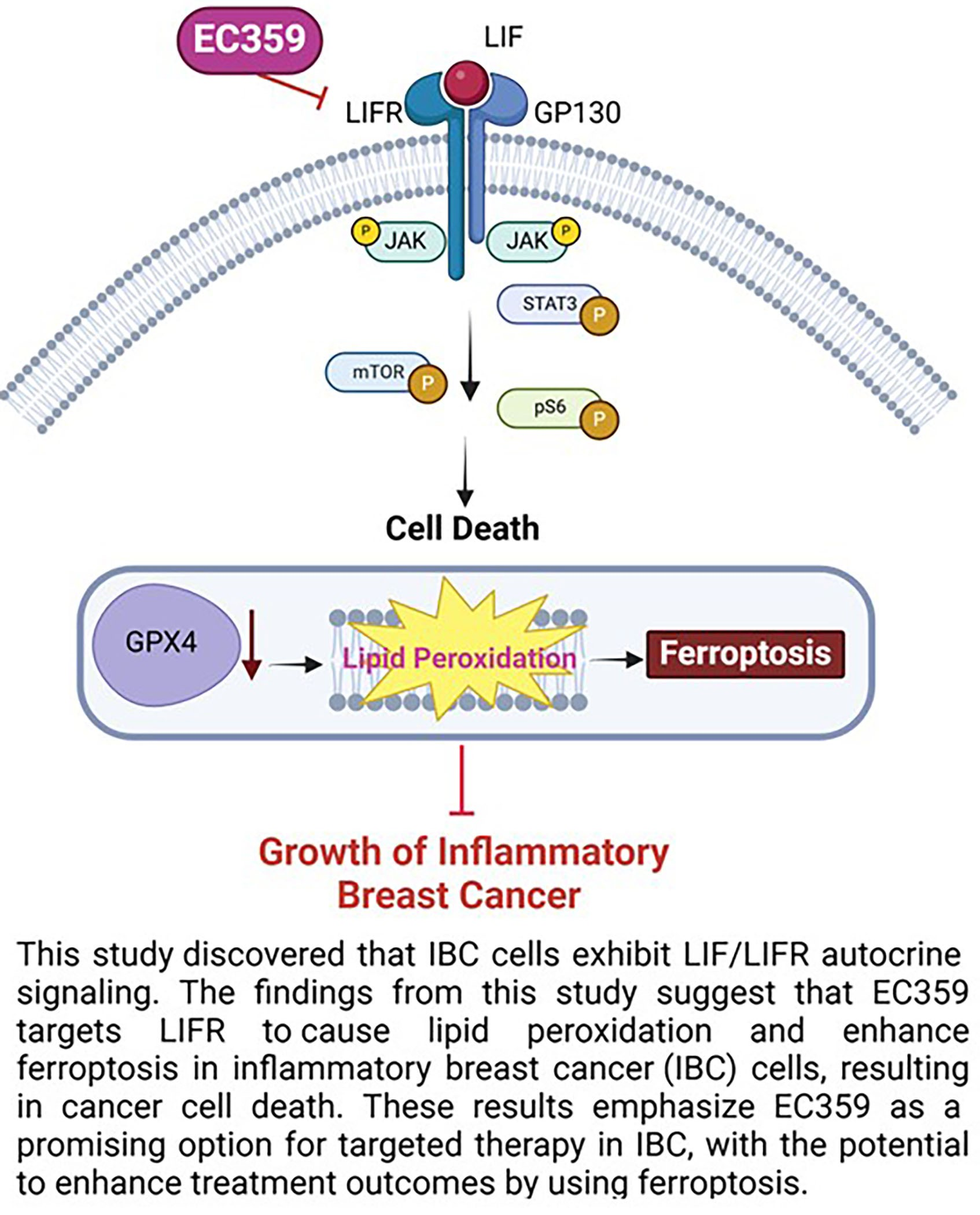 In conclusion, our findings indicate that the LIF/LIFR signaling axis is functional in IBC cells. The growth and invasion of IBC cells are reduced by the reduction in LIFR expression through siRNA or pharmacological inhibition. EC359 effectively inhibited LIFR signaling and decreased the viability of IBC cells in vitro and in vivo. LIFR inhibition activates apoptosis in IBC cells by promoting ferroptosis. Since EC359 is a small molecule inhibitor with favorable pharmacokinetics and bioavailability, it can be utilized to treat IBC either as a monotherapy or in conjunction with existing standard treatment protocols.