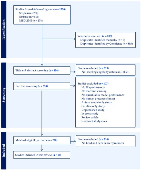 The electronic database search resulted in a total of 854 unduplicated articles for screening. Title and abstract screening excluded 519 articles based on the eligibility criteria shown in Table 1, such as studies aiming to evaluate different cell cultures, investigate drug resistance effects, or compare different spectroscopy parameters. Full-text screening further eliminated 107 studies that did not meet the inclusion criteria, resulting in a total of 228 studies meeting our primary eligibility criteria. Applying the secondary eligibility criteria shown in Table 2 resulted in a final of 14 studies when limiting to head and neck precancer and cancer. Figure 1 shows the Preferred Reporting Items for Systematic Reviews and Meta-analysis (PRISMA) flow diagram for the identification of studies.