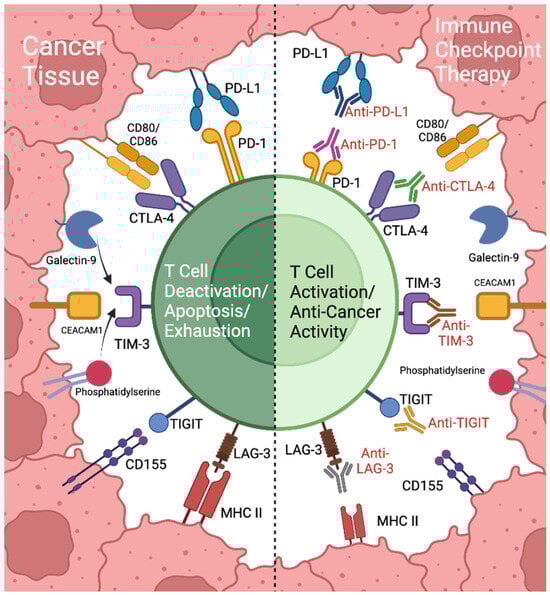 LAG-3, TIM-3, and TIGIT are additional immune checkpoints that contribute to immune suppression, particularly within the TME, and they each have unique mechanisms of action. LAG-3 binds to MHC class II molecules on antigen-presenting cells, which inhibits T-cell proliferation and cytokine production, leading to reduced immune activation [23]. LAG-3 is often co-expressed with PD-1 on T-cells, and its inhibition has been shown to further rejuvenate T-cells and enhance their anti-tumor activity [24]. TIM-3 binds to several ligands, including Galectin-9, phosphatidylserine, and Carcinoembryonic antigen-related cell adhesion molecules (CEACAM1), resulting in T-cell exhaustion by interfering with T-cell receptor (TCR) signaling, reducing cytokine production and promoting T-cell apoptosis [25]. TIM-3 is often expressed on Tregs and exhausted effector T-cells, and its role in regulating immune tolerance makes it a key checkpoint in sustaining chronic immune suppression in the TME [26]. TIGIT binds to CD155 on antigen-presenting cells and tumor cells, competing with the activating receptor 226 CD226 [27]. When TIGIT binds to CD155, it sends inhibitory signals through Immunoreceptor tyrosine-based inhibitory motifs (ITIM) in its cytoplasmic tail, which dampens T-cell and natural killer (NK) cell activity and decreases cytokine release [28]. TIGIT expression is associated with T-cell exhaustion, and blocking it can restore T-cell functionality and increase anti-tumor immune responses [28].