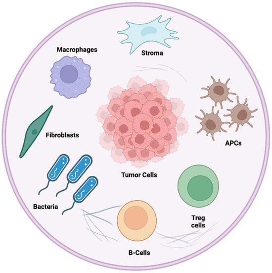 The tumor microenvironment contains diverse elements that influence cancer progression and outcomes. Different populations of immune cells, fibroblasts, stromal components, and microbes work in tandem to maintain niches in the tumor that can potentially influence responses to treatment. Created with BioRender.com.