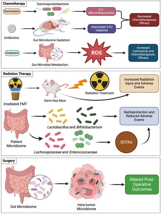 The microbiome influences outcomes in classical cancer treatment modalities. Gammaproteobacteria can convert gemcitabine into an inactive metabolite, reducing its efficacy in PDAC. Additionally, antibiotic depletion of the microbiome can reduce the efficacy of 5-FU and oxaliplatin. Oxaliplatin can work synergistically with resident gut microbiota that generate ROS that enhance the cytotoxicity of the drug. FMT studies have demonstrated that microbiomes that have been subjected to radiation can lead to poor prognosis and adverse events to radiotherapy. Conversely, it has been found that patient microbiomes that are enriched with Lactobacillus, Bifidobacterium, Lachnospiraceae, and Enterococcaceae have improved responses to radiotherapy and fewer adverse events, possibly due to the production of short-chain fatty acids (SCFAs) that promote anti-inflammatory pathways. Analyses of patient microbiomes have demonstrated a dynamic equilibrium between the gut and intra-tumor microbiomes that influence post-operative outcomes. Created with BioRender.com.
