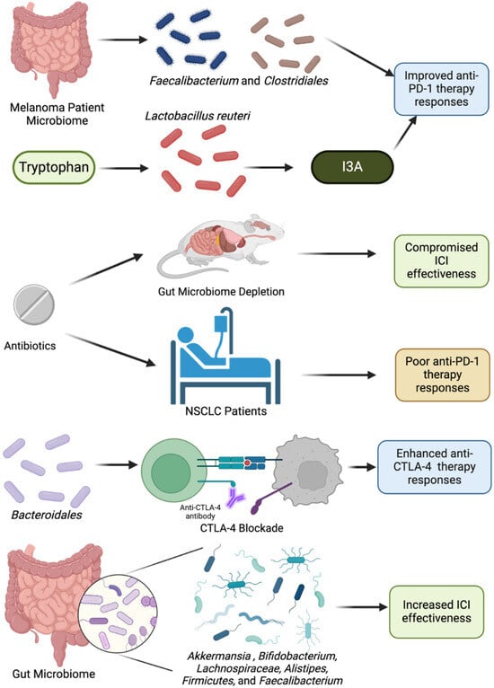 The microbiome influences ICI therapy outcomes. Fecal matter analysis of patients with melanoma demonstrated that responders to anti-PD-1 treatment had a microbiota that was enriched in Faecalibacterium and Clostridiales. Additionally, intratumor microbiomes that contained Lactobacillus reuteri showed improved responses to anti-PD-L1 therapy due to the metabolism of tryptophan into I3C. Antibiotic treatment of mice and patients is associated with diminished responses to ICI treatment, while certain genera such as Alistipes, Bifidobacterium, and Bacteroidales are associated with increased ICI effectiveness. Created with BioRender.com.