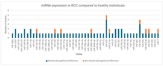 This variability significantly limited the comparability of findings and the potential for quantitative synthesis. Among the investigated miRNAs, miR-210 emerged as a central focus, with most studies demonstrating its overexpression in RCC patients compared to controls.