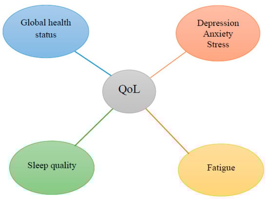 However, as the diagnosis and treatment of the disease have improved significantly over time, quality of life has become an important outcome measure in breast cancer clinical investigations and survivorship studies [11]. To evaluate and summarize the existing evidence on quality of life in breast cancer patients, numerous questionnaires have been developed. Among these, we focused on the following validated instruments, which are among the most common and well-developed tools for measuring quality of life in breast cancer patients: the EORTC QLQ-C30 (European Organization for Research and Treatment of Cancer Core Cancer Quality of Life Questionnaire), the Depression, Anxiety, and Stress Scale-21 (DASS-21), the Multidimensional Fatigue Inventory (MFI), and the Pittsburgh Sleep Quality Index (PSQI). We chose to implement these questionnaires because we believe that the four most important aspects of quality of life (Figure 1)—global health status, emotional state, fatigue, and sleep quality—are very well comprised within these assessment tools.