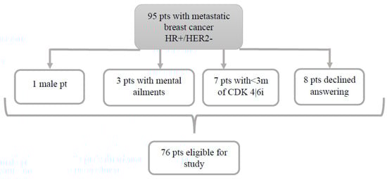 This study was conducted on a group of 95 patients diagnosed with HR+/HER2− metastatic breast cancer and treated with CDK4/6 inhibitors. Out of these, 76 patients met the inclusion criteria, and the reported outcomes are derived from this carefully selected group (Figure 2). Three patients with psychiatric problems, seven patients with less than three months of therapy with CDK4/6i, eight patients who declined to answer, and one male patient were eliminated from the study.