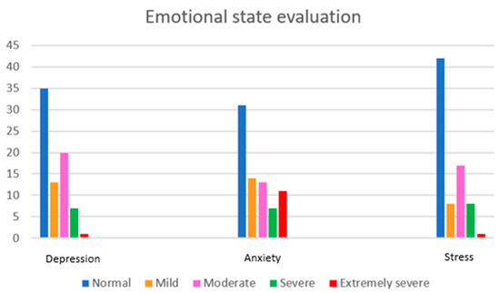 Each item is rated on a Likert scale from 0 to 3. Scores of related items are summed to determine the depression, anxiety, and stress scores. According to the manual, the resulting ratings are classified as: “normal, mild, moderate, severe, or extremely severe” [14].