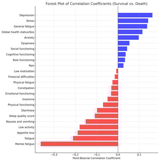 Forest plot of correlation coefficients for survival vs. death. Positive correlations (blue bars) indicate that higher scores on that variable are associated with survival. Negative correlations (red bars) indicate that higher scores on that variable are associated with death. The dashed vertical line at zero represents no association.