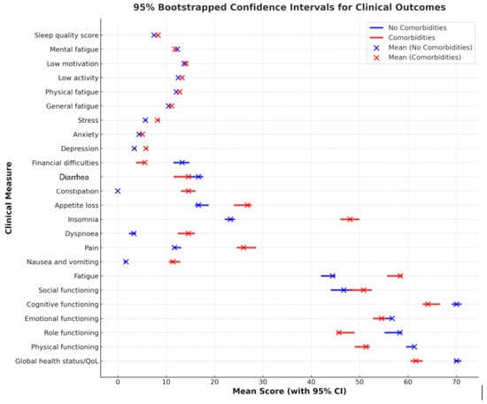 Bootstrapped 95% confidence intervals for clinical outcomes in oncology patients with and without comorbidities. Blue (No Comorbidities): represents the mean scores and 95% confidence intervals (CIs) for patients without comorbidities. Red (Comorbidities): represents the mean scores and 95% confidence intervals (CIs) for patients with comorbidities. Each horizontal line represents the range of the 95% confidence interval (CI) for a given clinical measure, while the dots indicate the mean values.