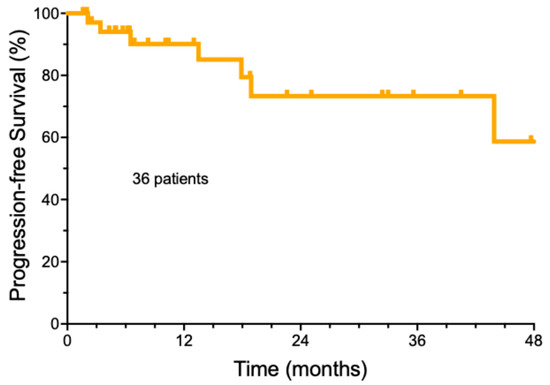The follow-up of the entire group of cemiplimab-treated patients was a median of 32.9 months ± 18.4, with a range from 3.7 to 61.1 months (Supplemental Table S2). The median number of cemiplimab doses was 8 (±6.3 doses StDev, range 2–39). The median duration of cemiplimab treatment was only 5.2 months (±5.6 months). A total of 22/36 (61.1%) patients achieved a complete remission, while ten patients had a partial response (27.8%), three patients had stable disease (8.3%), and one patient developed progressive disease (2.8%). For the entire group, the estimated median progression-free survival was undefined (Figure 1). A total of 21 patients (58.3%) remained free of recurrence over the entire period of observation. The majority of the patients who achieved a remission (19/21, 90.5%) were able to electively discontinue therapy, based on a previously published strategy [21]. Another 12 patients (33.3%) were alive with persistent CSCC. Deaths due to progressive CSCC were rare. Only one patient (2.8%) died due to CSCC within the study period. It should be noted that in this elderly population, two additional patients (5.6%) died of non-cancer-related causes. One patient is currently still undergoing cemiplimab treatment, and one patient was lost to follow-up.