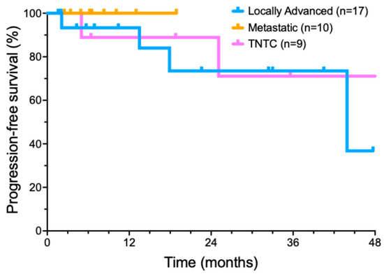 Our series included 10 patients who presented with metastatic CSCC. Potential follow-up was a median of 32.9 ± 14.8 months (range of 6.6–53.8 months). Eight of these ten (80%) patients achieved a CR with cemiplimab treatment; two patients had a PR. Median progression-free survival was not reached in this subset (Figure 2). By the analysis date, all eight CR patients remained in a long-term complete remission. Both PR patients (20%) developed recurrent disease.