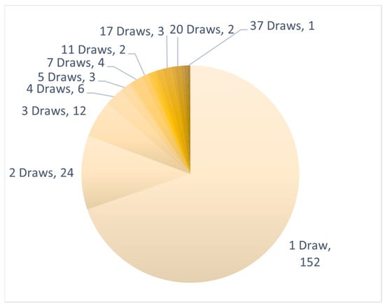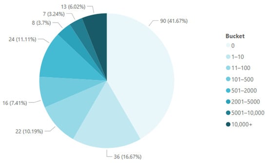 CSF-TC enumeration at primary draws: Clockwise from minimum to maximum, the pie chart represents the range of CSF-TC enumeration values (buckets), and the frequency with which each enumeration value was found is represented in percentages.