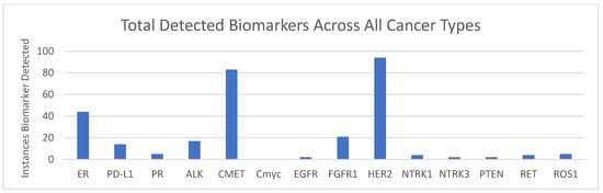 Biomarkers detected across all samples: The total number of case alterations were detected in each biomarker using ICC (ER, PD-L1, and PR) or FISH (remainder of markers) across all samples.