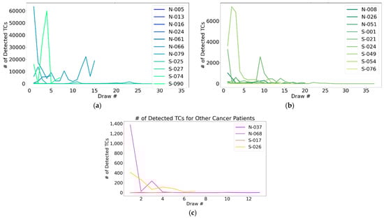 CSF-TC enumeration over longitudinal CSF draws: A representation of the ability to monitor CNS disease over time using detectable changes in CSF-TC enumeration, specifically including (a) patients with breast cancer; (b) lung cancer; and (c) other primary tumors. “Other cancers” included bladder, gastrointestinal, gynecologic, head and neck, hepatic, male genitourinary, neuroendocrine, pancreatic, renal, skin, and miscellaneous.