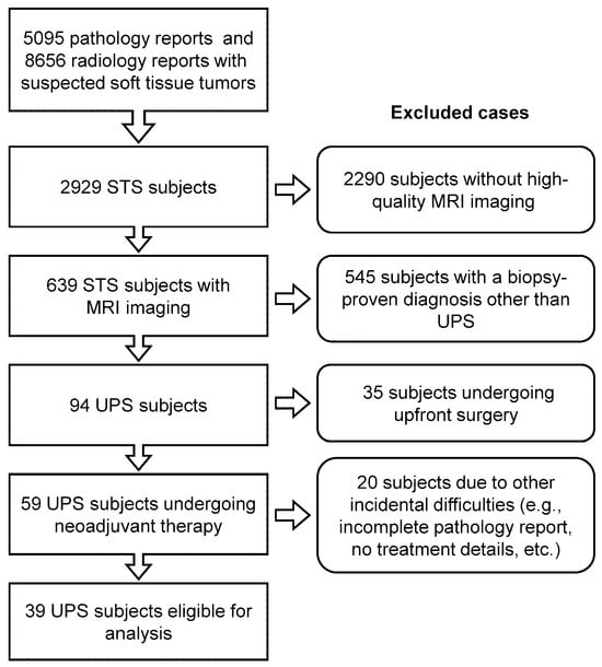 This retrospective study was approved by the Institutional Review Board (IRB) and received waivers for both Health Insurance Portability and Accountability Act (HIPAA) authorization and written informed consent. The institutional electronic data warehouse (EDW) was searched from January 2004 to December 2022 to identify patients (Figure 1) meeting the following inclusion criteria: diagnosis of biopsy-proven UPS, receipt of neoadjuvant radiotherapy or chemoradiotherapy, pre- and post-treatment MRI of the primary tumor, and surgical pathology analysis of viable and non-viable tumor components (necrotic material or hyalinization tissue). Patient demographics and clinical characteristics are summarized in Table 1, while treatment details and response to therapy are summarized in Table 2.