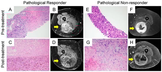 A 77-year-old woman with marked treatment response (pR), diagnosed with UPS with FNCLCC Grade III. (A) Pre-treatment core biopsy. The H&E-stained pathology slide shows abundant viable tumor cells colored dark purple (×100 magnification). (B) Contrast-enhanced fat-saturated T1-w MRI shows a heterogeneous, enhancing mass deep-seated in the right posterior compartment of the thigh. (C) Post-radiotherapy (5000 cGy/25 fractions) resection specimen. H&E-stained pathology slide (×40 magnification) shows tumor bed with marked treatment effect and 0% viable tumor. (D) Contrast-enhanced fat-saturated T1-w MRI showed a moderate increase in size compared to baseline and large, central areas of non-enhancing tissue, likely necrotic or hemorrhagic areas. Increase in maximum tumor diameter was +43%, +26%, and +21% in X, Y, and Z directions. (E) A 65-year-old woman with mild treatment response (pNR). Pre-treatment core biopsy. H&E pathology slide (×40 magnification) shows a spindle cell and pleomorphic cell population, diagnostic of UPS (Grade II). (F) Contrast-enhanced fat-saturated T1-w MRI shows a round-shaped deep-seated mass in the right posterior thigh, with small central areas of non-enhancing tissue. (G) Post-radiotherapy (5000 cGy/25 fractions) resection specimen. Tumor area with focal treatment effect (necrosis, chronic inflammation, and fibrosis), approximately 60% viable tumor. Hematoxylin–eosin stain, (×100 magnification). (H) Contrast-enhanced fat-saturated T1-w MRI showed a moderate increase in size compared to baseline. Increase in maximum tumor diameter was +41%, +23%, and +15% in X, Y, and Z.