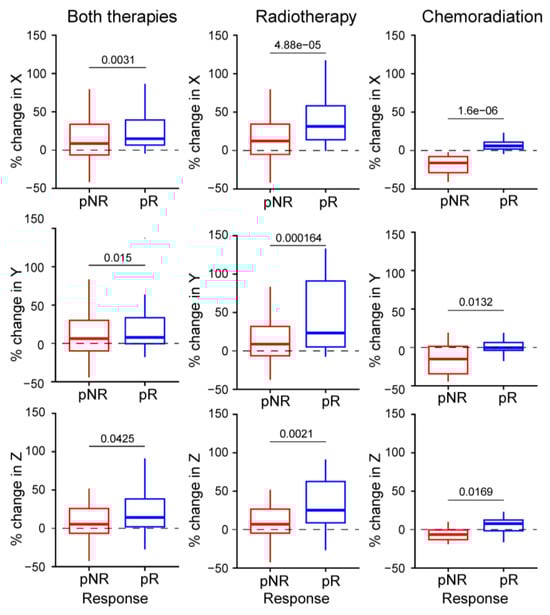 Percentage change in tumor sizes across the main axes (X, Y, and Z) for both therapies and within each therapeutic subgroup, including radiotherapy and chemoradiation, for responders (pR) and non-responders (pNR). Each plot shows a p-value for the mean difference (pR-pNR) between responders and non-responders, calculated using Tukey’s HSD test.