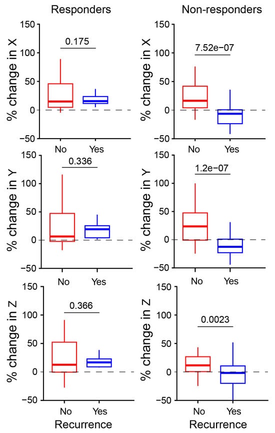 Percentage change in tumor sizes across the main axes (X, Y, and Z) for responders and non-responders, comparing patients with and without recurrence. Each plot shows a p-value for the mean difference between patients with (Yes) and without (No) recurrence, calculated using Tukey’s HSD test.