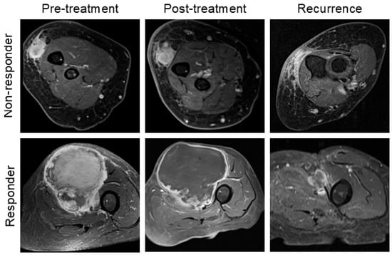 - Messiou, C.; Bonvalot, S.; Gronchi, A.; Vanel, D.; Meyer, M.; Robinson, P.; Morosi, C.; Bloem, J.L.; Terrier, P.H.; Lazar, A.; et al. Evaluation of response after pre-operative radiotherapy in soft tissue sarcomas; the European Organisation for Research and Treatment of Cancer-Soft Tissue and Bone Sarcoma Group (EORTC-STBSG) and Imaging Group recommendations for radiological examination and reporting with an emphasis on magnetic resonance imaging. Eur. J. Cancer 2016, 56, 37–44. [Google Scholar] [PubMed]