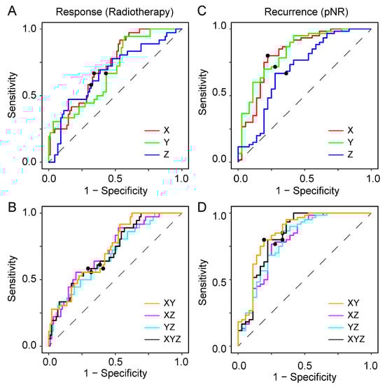 Optimal cutoff analyses were performed to predict both pathological response to radiotherapy and local recurrence in non-responders (Figure 6). For predicting pathological response, the longest axial diameter (X) demonstrated the best overall performance, achieving a sensitivity of 0.69 and a specificity of 0.63 with an optimal cutoff of +19.6% (Table 6); smaller X changes corresponded to pNR. Figure S1 presents the results of optimal cutoff analyses for predicting pathological response to nCRT.