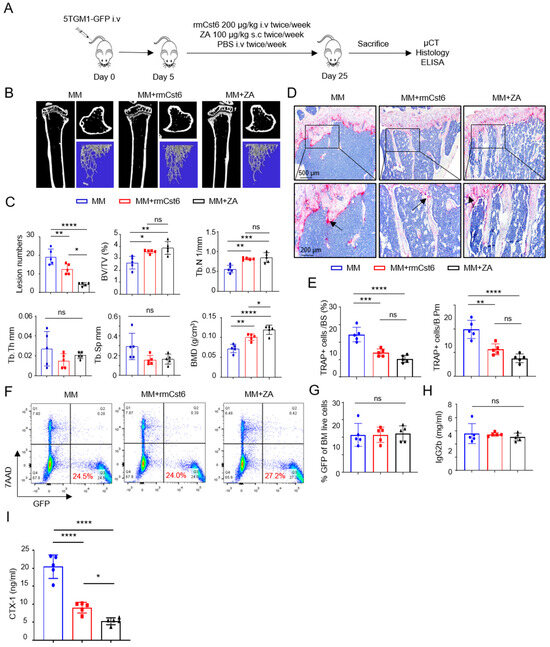 Six to eight-week-old female C57BL/KaLwRij mice (Harlan Mice, Horst, The Netherlands) were injected with 1 × 106 5TGM1-GFP cells intravenously via the tail vein and randomized into 3 groups (MM mice, n = 5 per group). Five days after injection of tumor cells, mice were treated with either PBS (100 µL), rmCst6 (200 μg/kg) via intravenous (i.v.) injection twice a week, or Zoledronic Acid (ZA) (100 μg/kg) via subcutaneous (s.c.) injection twice a week. On day 25 post-tumor cell inoculation, when most mice had started to develop paraplegia, the experiment was terminated, and mice were sacrificed. Blood samples were collected every week. All animal procedures adhered to a protocol approved by the local Institutional Animal Care and Use Committee (IACUC) at the University of Arkansas for Medical Sciences.