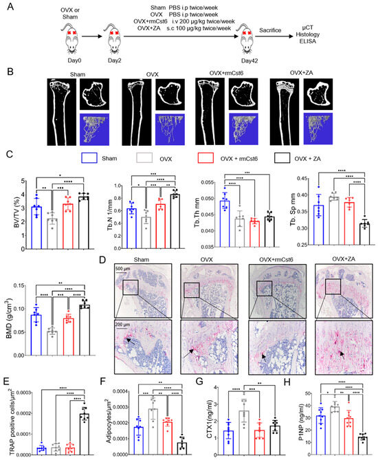 Six-month-old female C57BL/6J mice (Jackson Laboratories) were utilized in this study. Mice were anesthetized with chloral hydrate and subjected to ovariectomy or sham operation. Following OVX surgery, mice were randomly divided into 4 groups to receive the following treatments: (1) sham operation + PBS (sham, n = 8), (2) OVX + PBS (OVX-PBS, n = 8), (3) 100 μg/kg Zoledronic Acid (OVX-ZA, n = 9), (4) 50 μg/kg rmCst6 (OVX-CST6, n = 10). Two days following surgery, mice were administered drugs for 6 weeks via i.p, i.v, or s.c injection. OVX-ZA mice received injections twice a week, while OVX-CST6 mice received injections every other day. After 6 weeks, mice were sacrificed. Mouse serum, legs, and vertebrae were collected and stored at −80 °C until used. Successful OVX was confirmed by an assessment of uterus weight and weight development during the experiment.