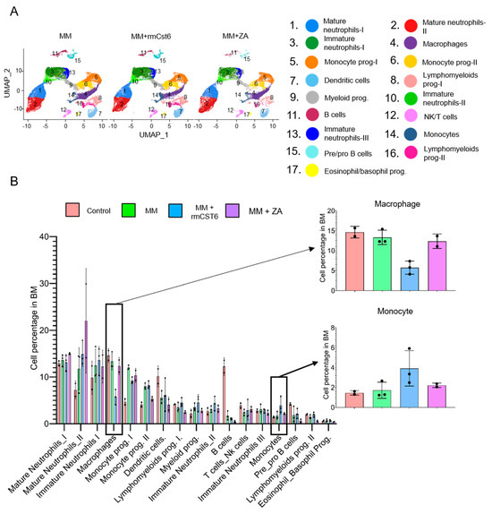 Single-cell RNA sequencing (scRNA-seq) was used to examine the effect of ZA and rmCst6 on the bone marrow (BM) cell composition in MM mouse models. Based on expression, key gene cells were sorted into specific categories. The uniform Manifold Approximation and Projection (UMAP) plot of BM mononuclear cells indicated that MM cells induced an increase in the percentage of monocyte progenitors and a decrease in B cell percentage in BM (Figure 3A,B). When compared with other groups, only rmCst6-treated mice showed a decrease in BM macrophage percentage and an increase in BM monocyte percentage (Figure 3A,B), implicating decreased osteoclast number is due to decreased precursors of osteoclast. ZA-treated mice alone showed an increase in BM mature neutrophil percentage (Figure 3A).